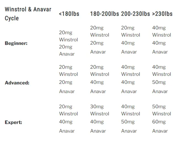 In the weight class of 180 to 200 pounds for advanced or intermediate anabolic users, the dosage would be 20mg Winstrol with 40 mg Anavar. Again, the individuals with 200 to 230 lbs of weight should take 40 mg of Winstrol and Anavar. For individuals with more than 230 pounds of body weight, the dosage would be 40 mg of Winstrol and 50 mg of Anavar.