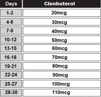 The cutting dosages for Clenbuterol are 120 to 160 mcg per day for both men and women. Generally, the cycles for Clenbuterol last 28 to 30 days. In this period, the dosage regulation would gradually increase, and the final days would observe the highest amount of dosing.
